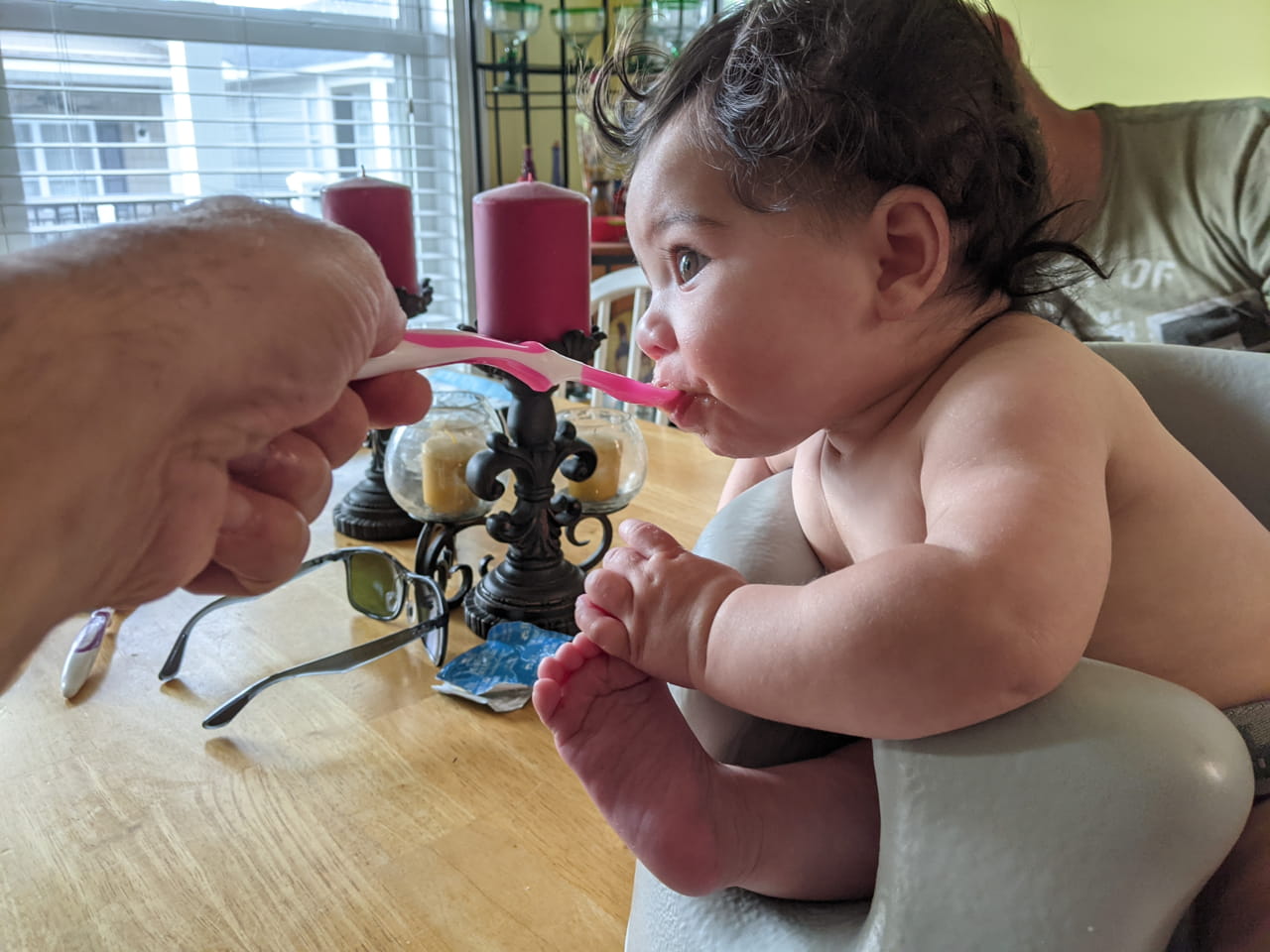 - When you put a spoon in her mouth, she curls her tongue back instead of pushing the spoon out